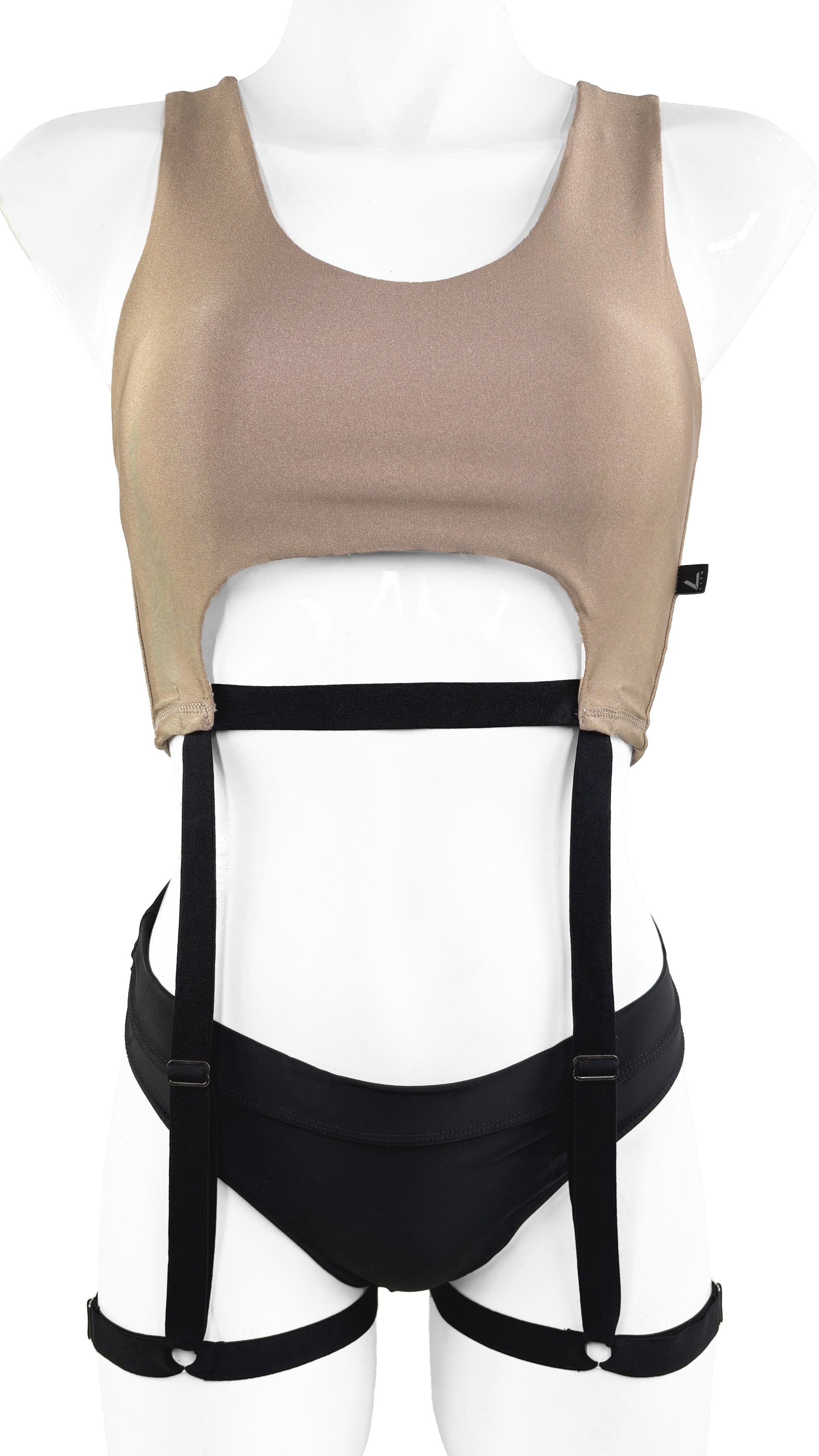 Crop Top con liguero, con escote básico redondo, abdomen semi descubierto y espalda cerrada, ligueros ajustables de largo y ancho de pierna.