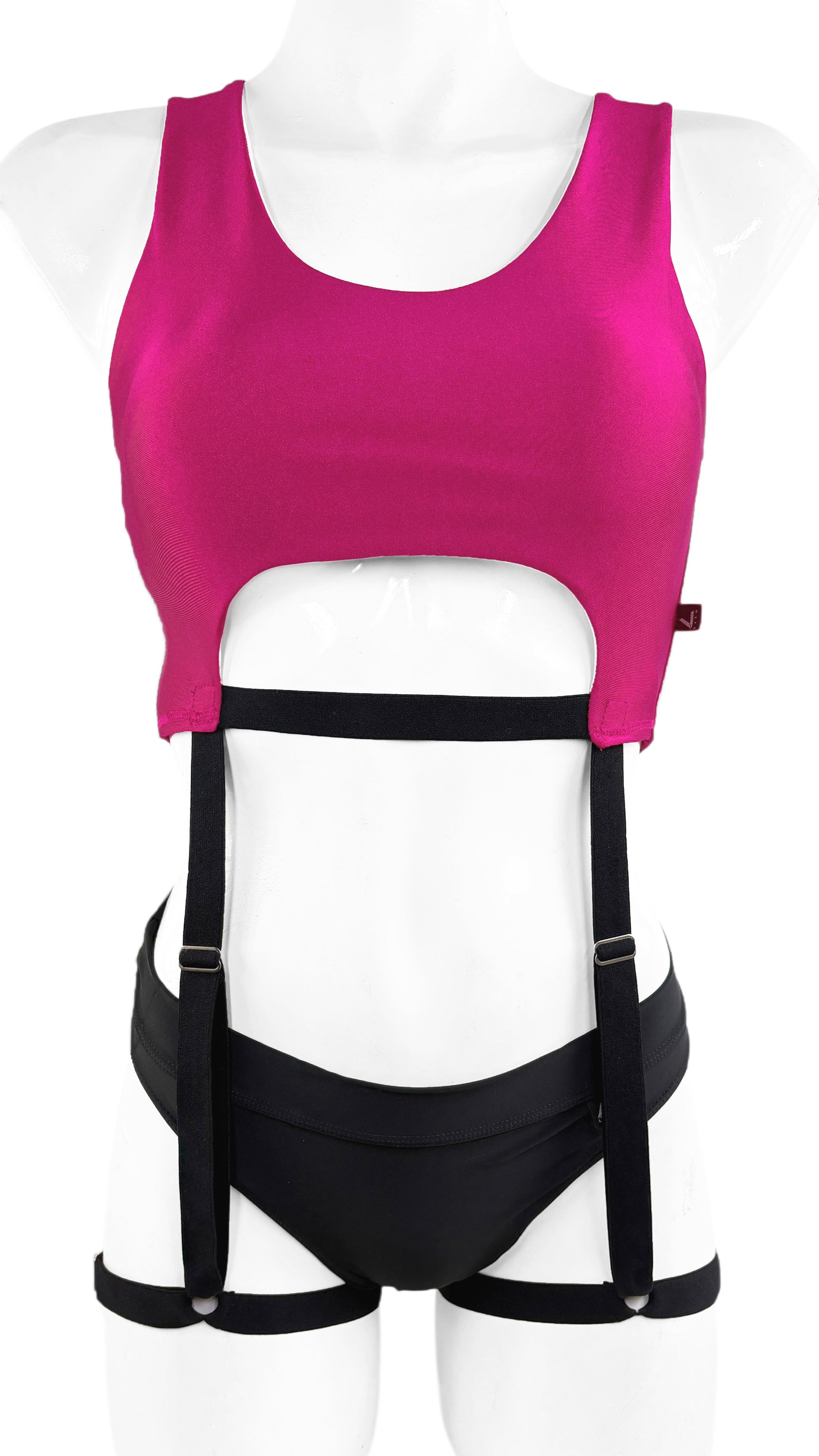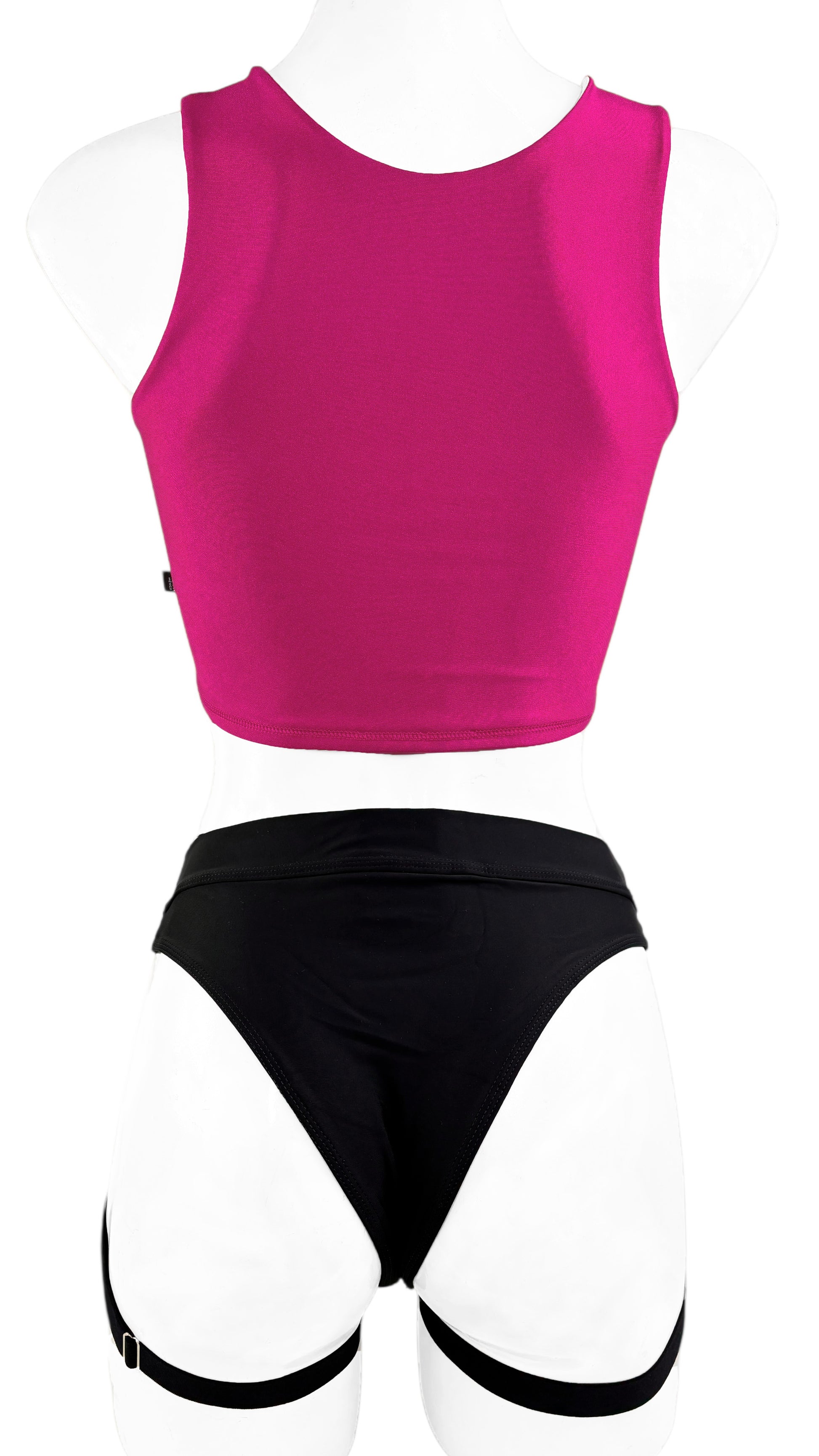 Crop Top con liguero, con escote básico redondo, abdomen semi descubierto y espalda cerrada, ligueros ajustables de largo y ancho de pierna.